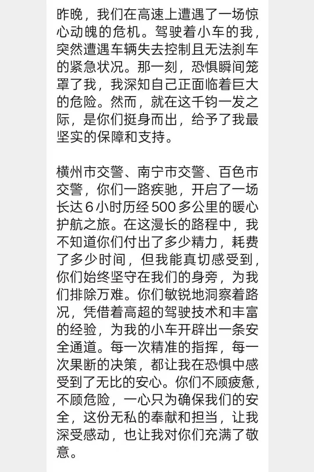 “刚开始失控的时候,我们都急哭了,感觉天都要塌了。后来看到一路上有那么多交警全程守护,心里慢慢就踏实了,情绪也平复了下来。”1月10日上午,左先生专程来到百色交管指挥中心,紧紧握住民警的手再三表达谢意。