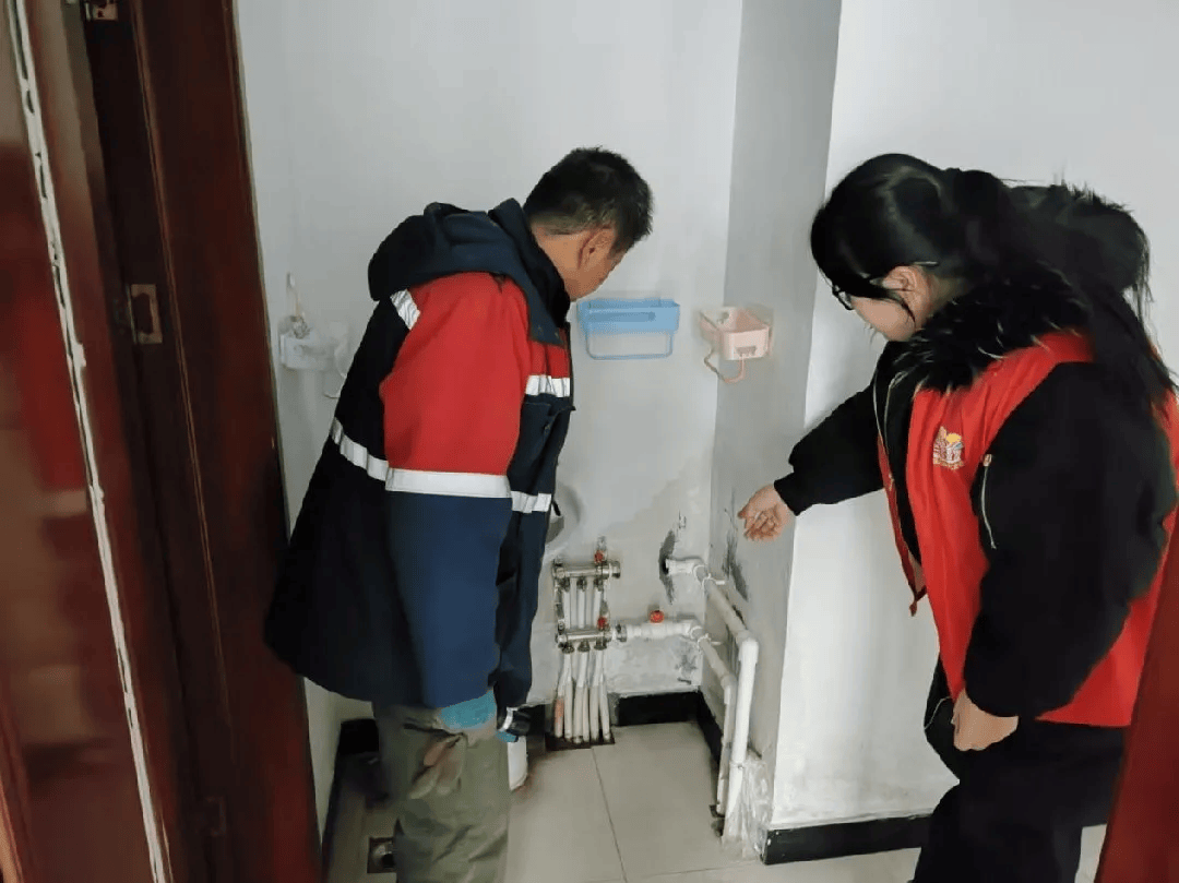 利通区朔方社区工作人员与供热公司工作人员到左营公租房小区居民家中查看暖气管道漏水情况