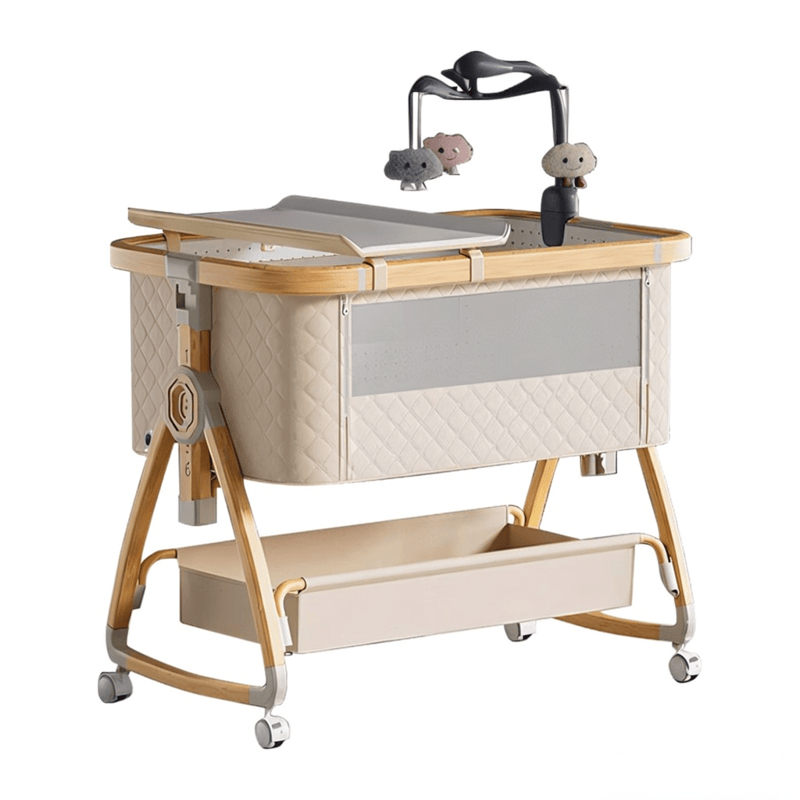 轮子设计带刹车,让床在不同房间移动更加轻松,同时也能固定在所需位置,保证宝宝的安全。摇摆功能和音乐玩具架也非常贴心,摇摆杆可以轻轻摇动,帮助宝宝安稳入睡,而悬挂的音乐玩具还能吸引宝宝注意力,促进感官发展。