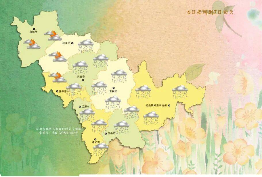 6日夜间到7日白天,全省多云,松原东北部、长春、四平东部、辽源、吉林、通化北部和东南部、白山、延边、长白山保护开发区有雨夹雪或小雨转小雪,其中白山东部、长白山保护开发区部分地方有中雪。