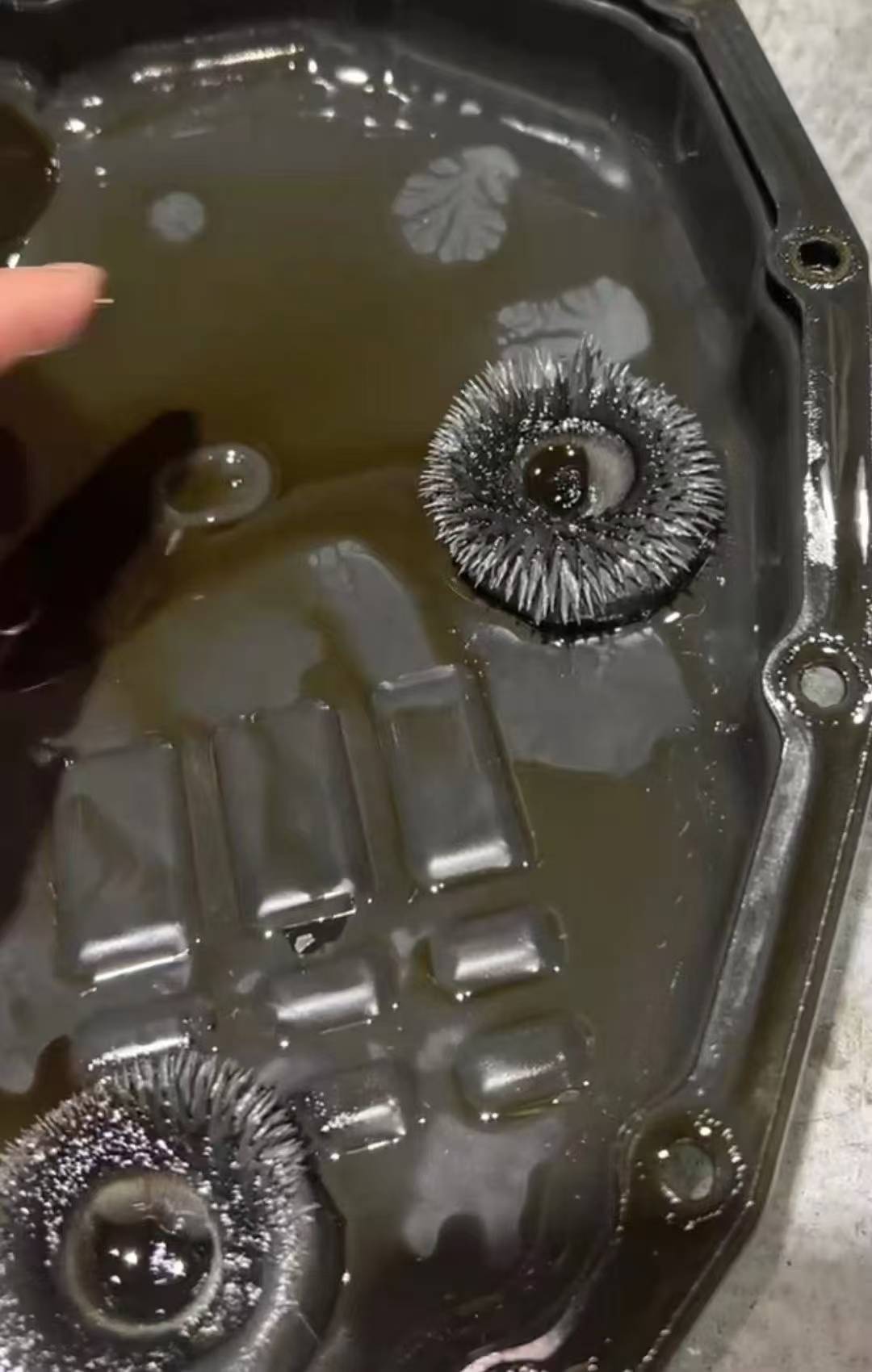 大众途观行驶6万公里,保养时发现变速箱油较黑。技师采用拆油底壳清洗、更换变速箱滤芯的方案,拆下油底壳后发现磁铁上吸满碎屑杂质。清洗杂质和油泥、更换滤芯、加入专用变速箱油后,着车挂档检查油位,试车完工。客户反馈开着比以前顺畅多了。