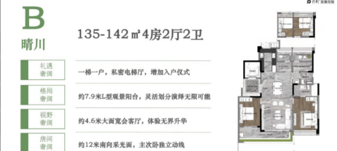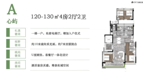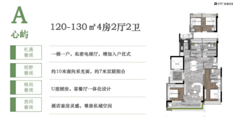 建面约120-130㎡四房两厅两卫作为进阶改善主力户型,空间格局规划科学,打造独梯独户归家体系,独立前厅过渡,强化居家私密性与尊崇感,隔绝公共区域干扰,营造专属归家仪式感。户型搭载约7米双联阔景观景阳台,横向拉伸空间尺度,直面园林景致与滨河风光,最大化吸纳自然采光与通风,四季风光尽收室内。室内采用LDK客餐厨一体化通透格局,消解空间壁垒,拓展公共活动区域,家人互动动线流畅,日常聚餐、休闲会客更显从容。U型厨房动线合理,收纳空间充足,适配中式烹饪习惯,功能布局紧凑实用,全明空间设计,每个功能区皆开窗通风,居住干爽舒适,完美适配三口之家与二胎家庭的日常居住需求。